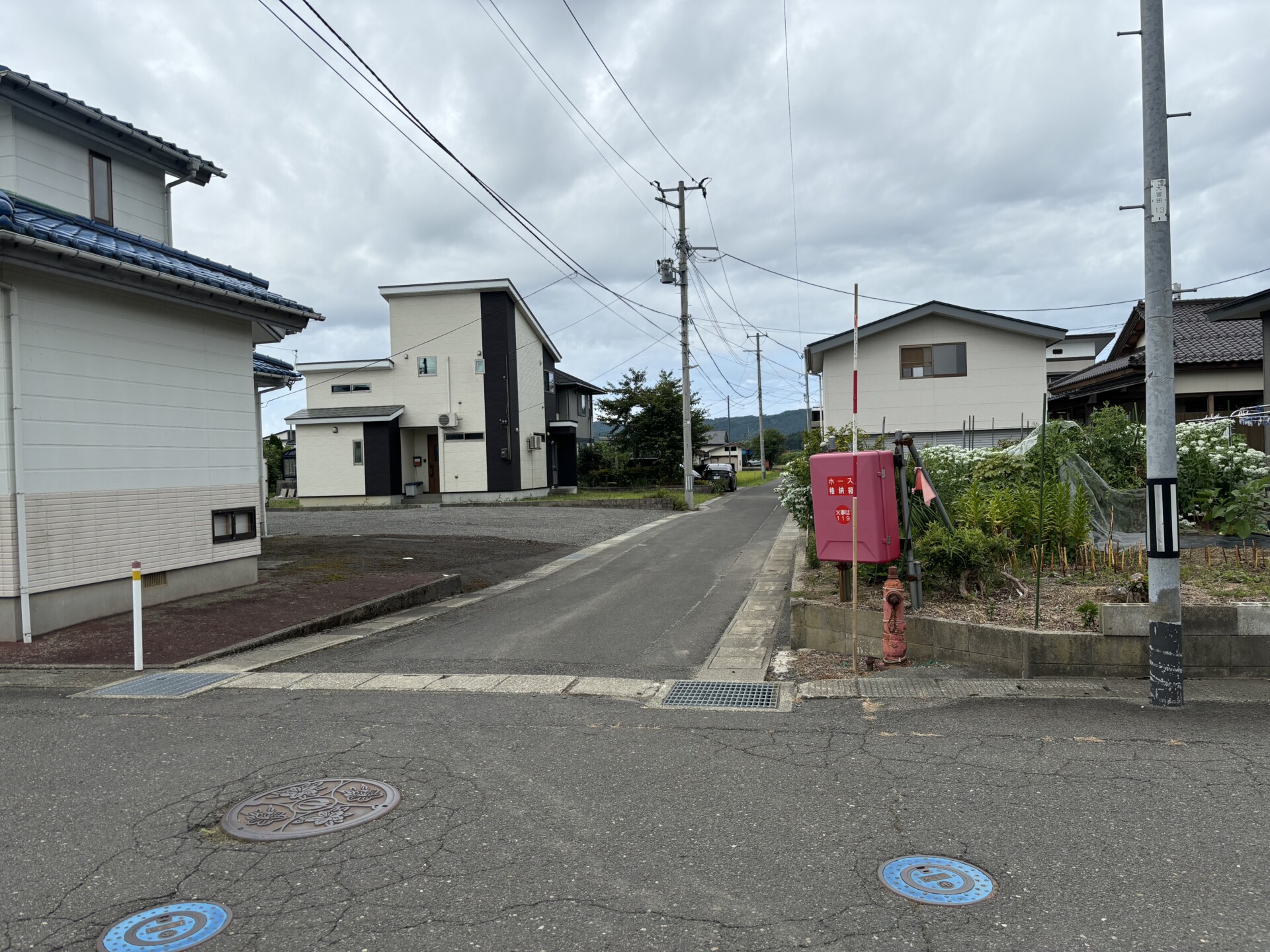 少し進むと、赤い消火栓と赤い消火ポンプボックスが右手に見えます。