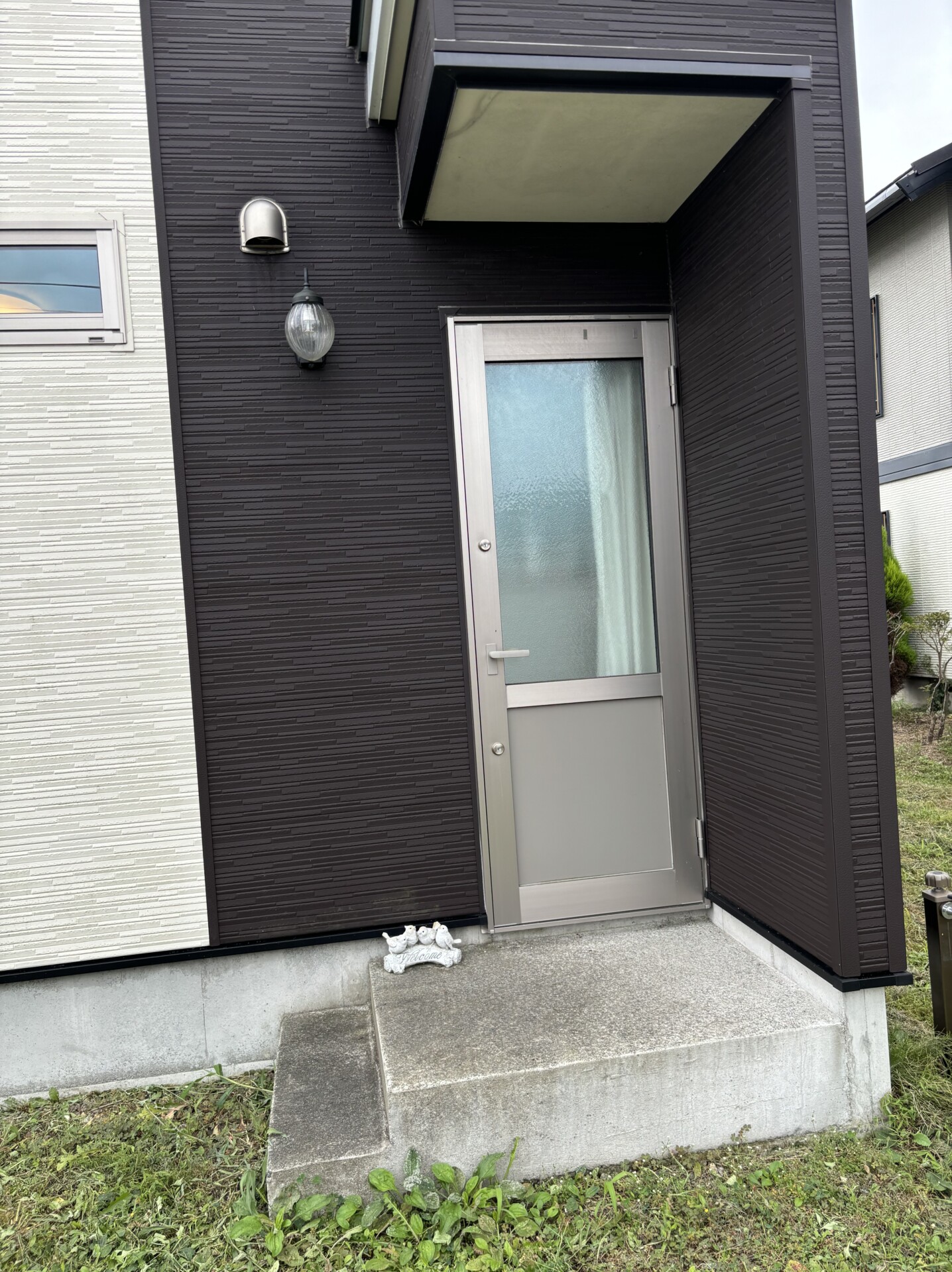 玄関の前に小鳥のオブジェが置かれています🐤